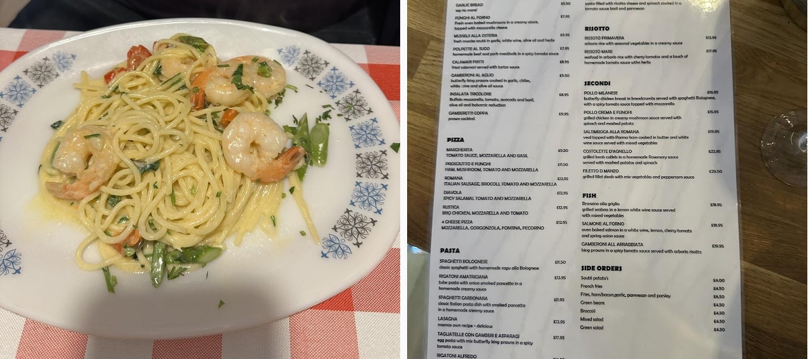 Must-try dishes include the Spaghetti Bolognese and the Risotto Primavera, along with their array of pizzas, including the classic Margherita.